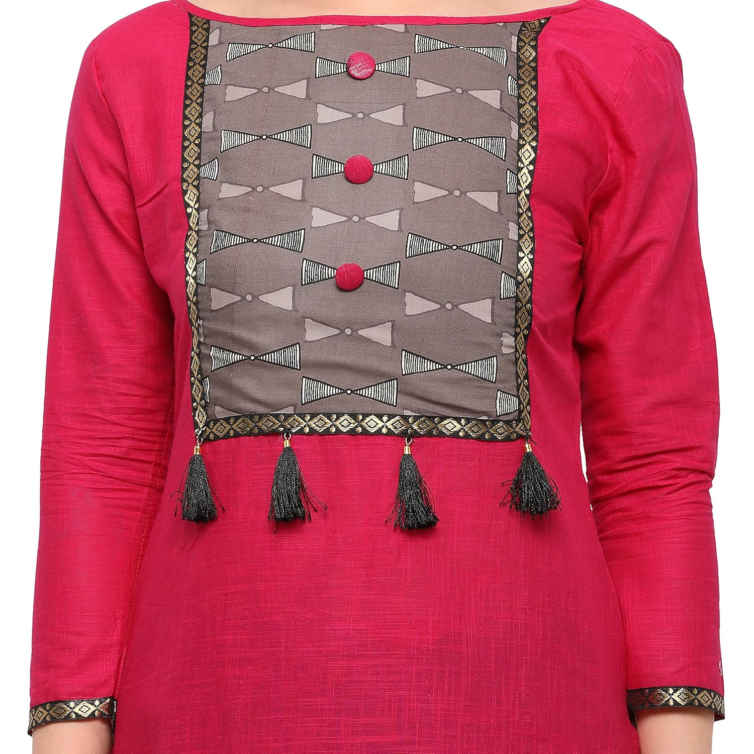 - Top - :Cotton Slub. The Top Is Beautifully Designed With A Smart Printed Centre Patch. The Same Is Embellished With Pink Buttons And Beautiful Black Tassels Hanging At The Ends. There Is A Beautiful Contrasting Lace Running At The Bottom Of The Top. So Ladies All You Need To Do Is To Get It Stitched To Your Size.